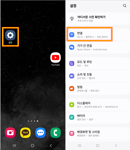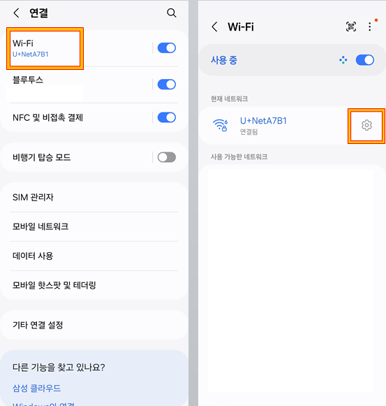 '와이파이' 메뉴를 클릭합니다. 현재 연결중인 와이파이(현재 네트워크) 오른쪽 '톱니바퀴 모양'을 선택합니다.
