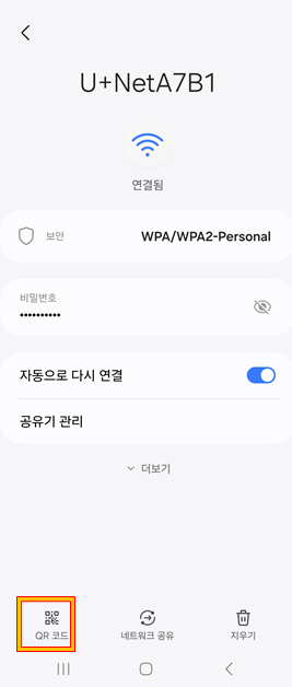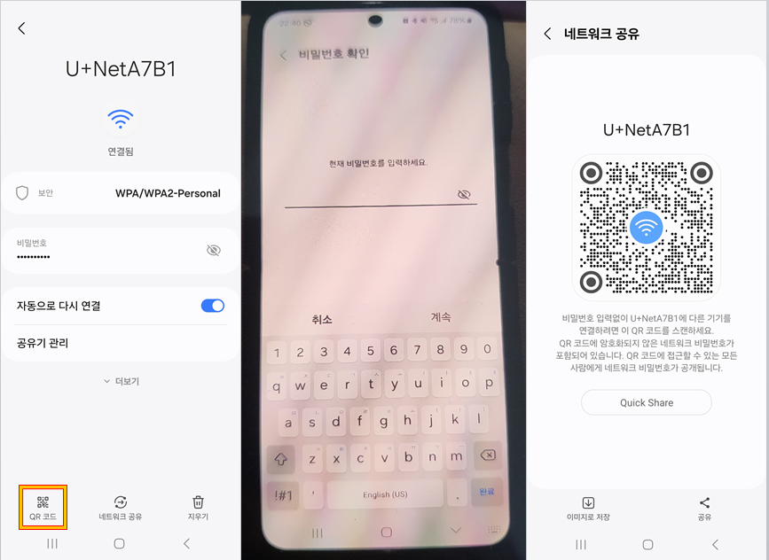 비밀번호를 입력하라고 나올 경우, 와이파이 비밀번호를 입력하는 것이 아니라 핸드폰 잠금 비밀번호를 넣으셔야 합니다. 핸드폰을 켜거나 잠금 상태를 해제할 때 쓰는 비밀번호를 넣어야 합니다. 그러면 제일 오른쪽 화면처럼 와이파이에 접근할 수 있는 QR코드가 나옵니다. (저는 추후 활용을 위해 이미지로 저장하고 즐겨찾기 폴더에 넣어두었습니다.)