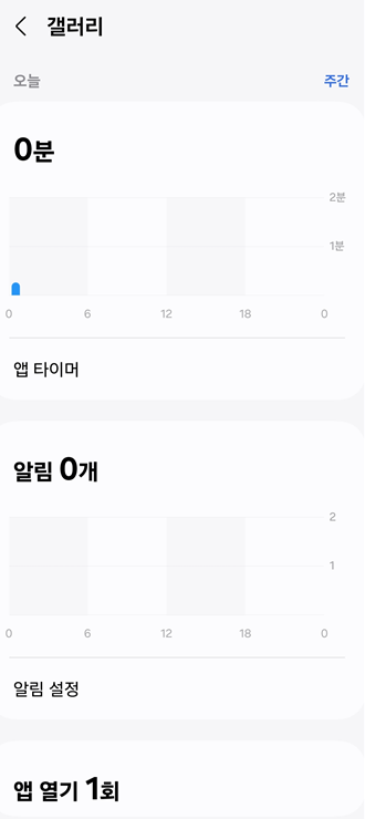 사용기록을 확인합니다. '오늘' 사용시간과 (우측 상단) '주간' 사용시간을 확인할 수 있습니다.