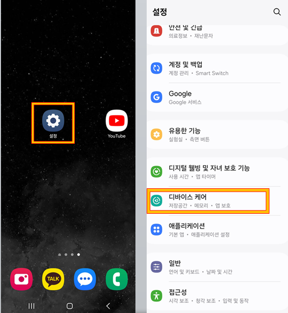 '휴대폰 '설정' - '디바이스 케어'를 누르세요.