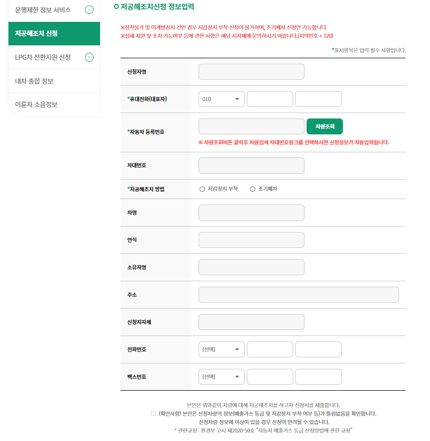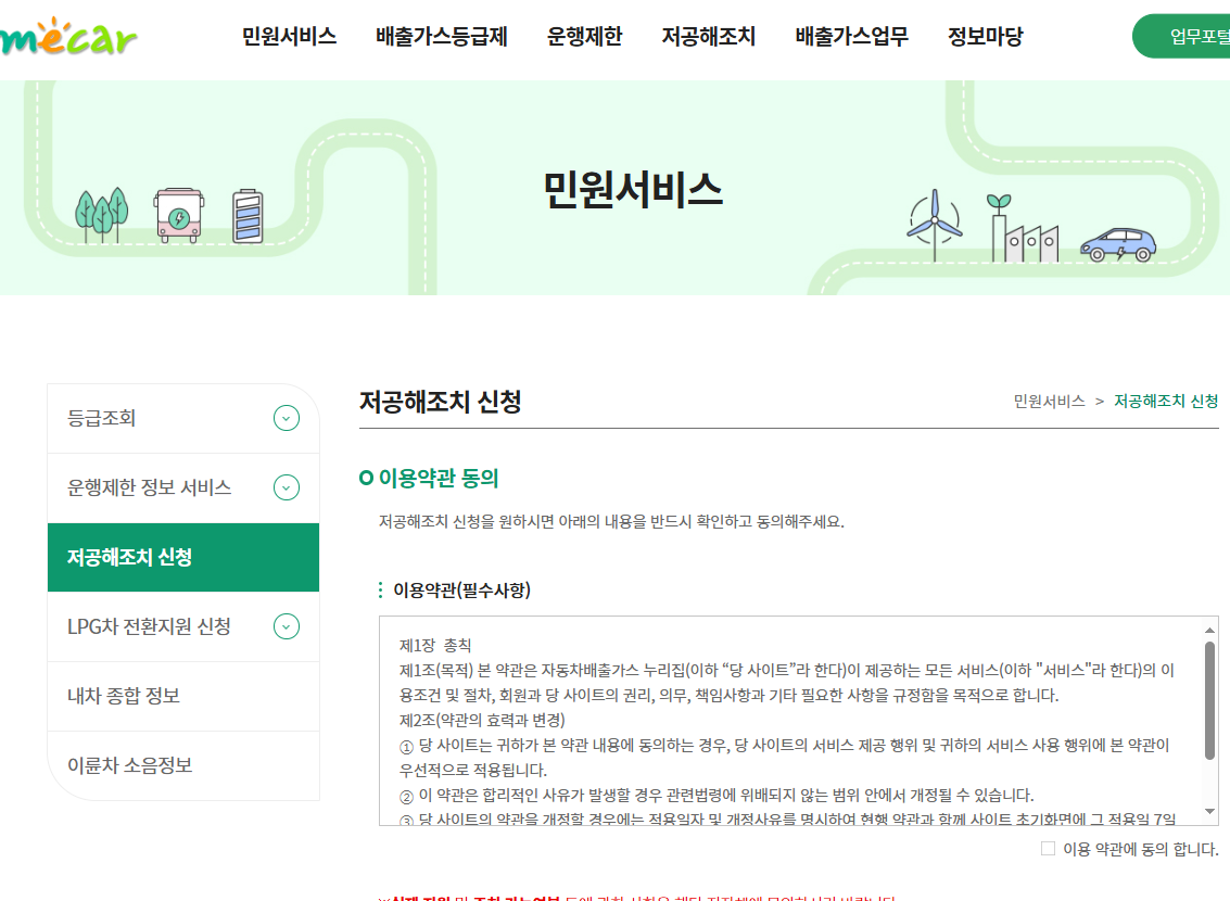 - (상단 [회원가입] 클릭하여 가입한 후) "민원서비스->저공해조치 신청" 접속(이용약관 동의 및 동의합니다 클릭)