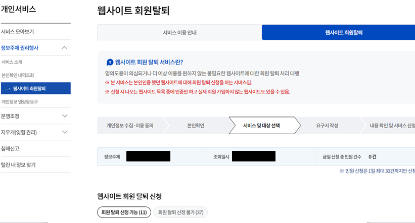 - 내가 가입한 웹사이트 현황을 보고 회원탈퇴 서비스를 신청할 수 있습니다.