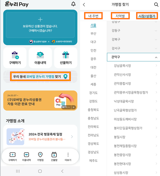 온누리Pay앱 우리 동네 가맹점 찾기